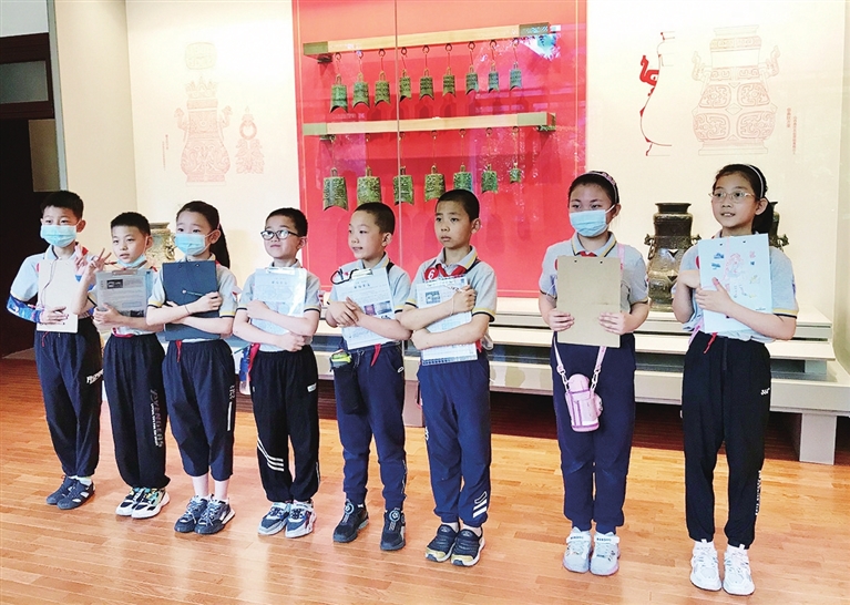 步入青铜的世界,同学们在一件件器物上,认识了青铜器的不同纹饰,凤鸟纹、兽面纹、涡纹。眼观耳听之后,同学们在学案上做连线题,连接正确的纹饰和配套青铜器。在三号楼历代钱币展厅,通过新媒体视频展示,孩子们了解了货币演变发展历史,对贝币、布币、刀币等不同钱币,都有了形象的认知。