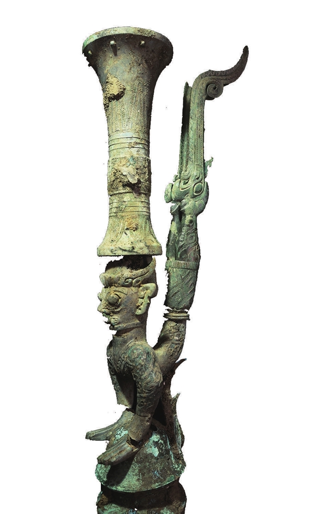8号“祭祀坑”新发现的顶尊蛇身铜人像分为三部分,中间是一个人首蛇身、凸目獠牙、戴有牛角面具的铜人像,它的双手撑在一个带方座的青铜罍上,头上还顶着一个朱砂彩绘觚形尊,但在坑里没找到它的下半身。