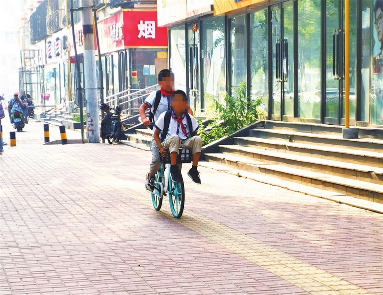 这是记者6月18日在永乐北街拍到的图片,清晨上学时分,一个学生骑着一辆共享单车,其同伴居然坐在车筐上,在人行道快速通行。共享单车的车筐承重量只有约5公斤,如此骑行可能导致骑车人的方向掌握不准发生事故,或者车筐突然脱落导致“乘车人”受伤。作为孩子的监护人,一定要对孩子进行安全教育,防止因侥幸或无知而遭遇意外。 申波 摄