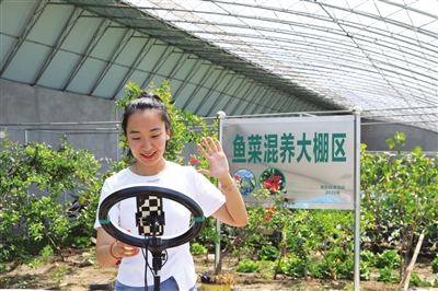 支起三脚架、打开补光灯……一切准备就绪,早8点,程玉姣准时开始了直播这项“新农活”,一部手机成为了“新农具”,而身后的“鱼菜混养”大棚就是她的“直播间”。