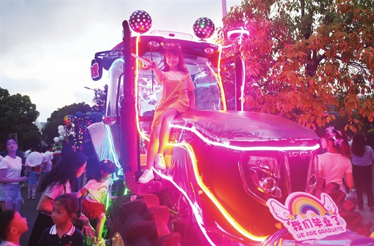 6月19日,人们在华中农业大学参加农机花车巡游。