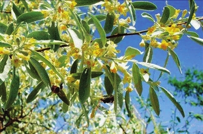 父亲讲,这树叫沙枣树,是北方特有的树种,是曾曾祖父他们那一辈人年轻时栽种的。一百多年风风雨雨与我的长辈们朝夕相伴,成了人们生活中不可缺少的伙伴,也成了村子里的一处景观。沙枣树一年四季引来无数喜鹊、麻雀和各种蜂蝶,为院子增添了生机。每当谷雨前后,伴随着绿叶的生长,树冠上便泛起一层淡黄色的小花。小小的黄花呈五角形, 在北方强劲的春风吹拂下,展示出朴实、顽强的风范。几天后,花谢了,叶密了,到了初夏便绿荫蔽日,又遮严了半个院子。于是树荫下便成了我们纳凉、吃饭、小憩、听故事的好地方。