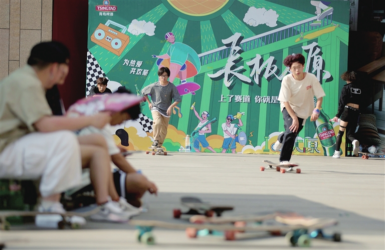 6月21日是世界滑板日,滑板爱好者们在长风商务区会聚在一起“玩板儿”庆祝。2020年东京奥运会滑板正式成为比赛项目,我市越来越多市民爱上这项运动。 牛利敏 王韵菲 摄