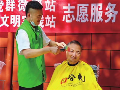 当天上午,空巢老人张大爷和老邻居结伴来到电镀巷口的网格党群微帮站。大家先在“集福墙”写下自己的微心愿和微祝福,接着体验爱心理发。两位理发志愿者询问居民对发型的要求后,开始熟练地理发。