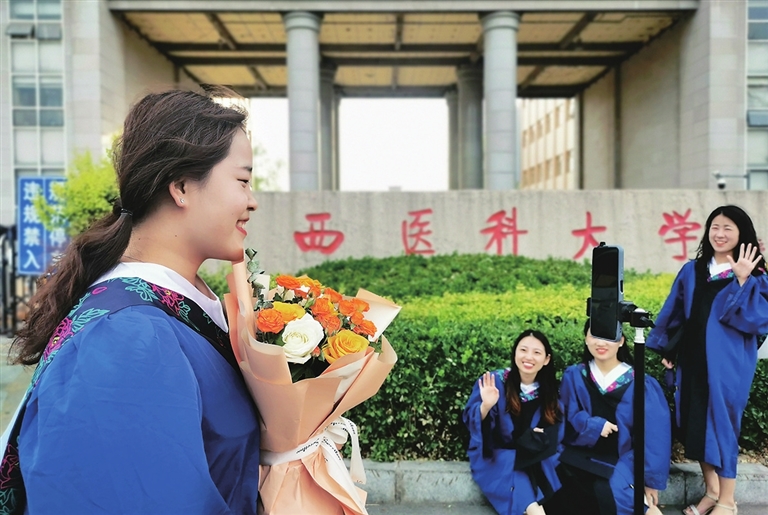 6月21日,山西医科大学的毕业生正在用网络直播的方式,记录校园美好生活,留下美好青春回忆。 牛利敏 摄