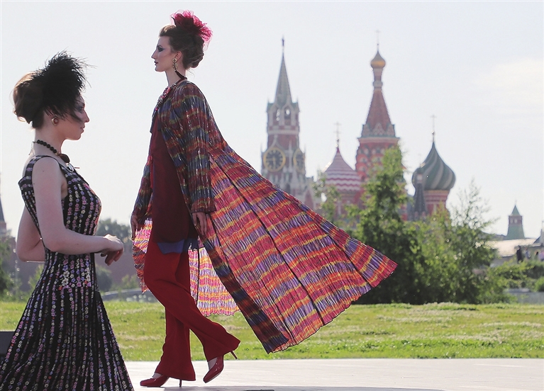 6月20日,模特在俄罗斯莫斯科扎里亚杰公园举行的莫斯科时装周上展示设计师斯拉瓦·扎伊采夫设计的服装。 新华社 发