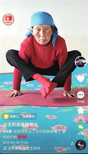 高难度瑜伽动作和银发的农村老人,形成强烈的反差感。这种画面不断刺激着看客的眼球,这条视频最终收获7.6万个点赞。而随着武启莲视频账号的活跃,玉狗梁也意外走红。