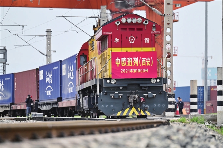 西安国际港务区,运输车辆往来繁忙,中欧班列长安号汽笛声声。今年前5个月,长安号累计开行1399列,开行量、重箱率等核心指标稳居全国前列。