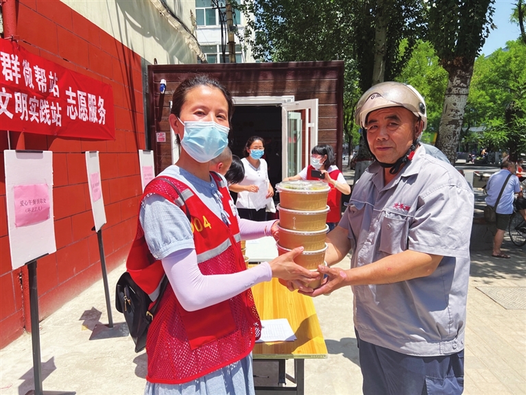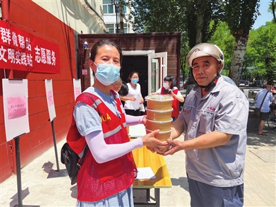 6月23日,老军营街道桃南一社区联合爱心企业,为快递小哥、环卫工人、网约车司机等新就业群体,以及高龄老人和低保户赠送爱心餐,送去夏日的一份清凉。 侯慧琴 安 炎 摄