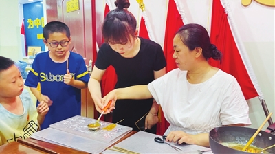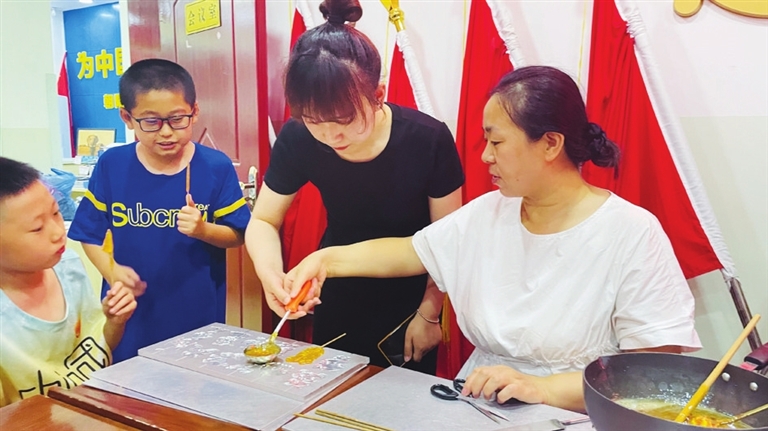 “我在钟楼街见过这样的糖画,可漂亮了……”6月22日上午,孩子们来到郝庄镇朝阳二社区,看到糖画艺人正在表演,不由得被吸引,目不转睛地观看。花朵、蝴蝶……糖画艺人拿着盛有糖稀的勺子,随着双手轻轻摆动,糖稀在降温板上勾勒出漂亮的图案。