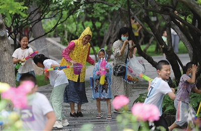 6月25日,桃南一社区在碑林公园开展“欢乐消暑泼水节”活动,孩子们拿着水枪、水盆,快乐地享受夏日清凉。 米国伟 摄