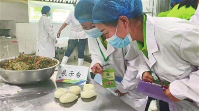 发好面、拌好馅、擀面杖、大蒸屉……比赛开始前,食堂师傅们早已蓄势待发。团体比赛时,3组参赛队员提前分工、各司其职,一波“流水线”的操作呈现出来。张师傅揉面有条不紊,仙师傅擀皮干净利落,黄师傅包包子皮白手净。32分、43分、34分……评委小组根据包子的外形、大小、数量、质量等方面进行综合评分,推选出了本次比赛的优胜团队。