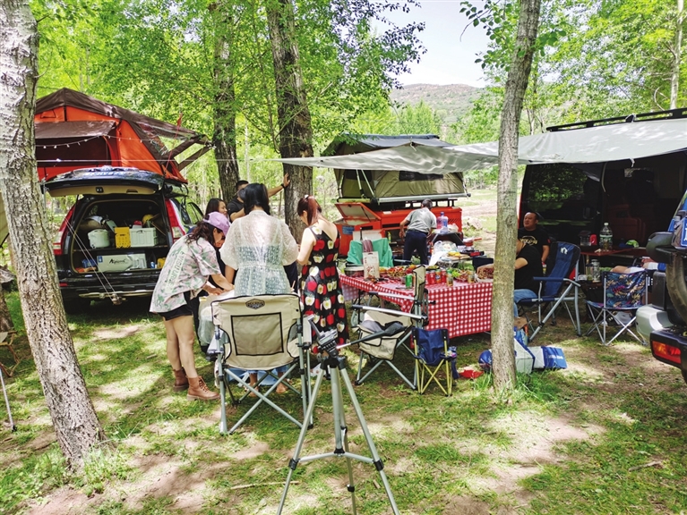 6月23日早8时,林琪将租好的帐篷、折叠桌、野餐垫等,放到汽车后备箱,赴一场与大自然的约会。上午9时,林琪一行人来到了景区,在园子沟附近搭建好帐篷后,便在周边游玩了起来。“园子沟池清水浅,非常适合亲子家庭在此戏水游玩。”林琪带着孩子一边玩一边说。