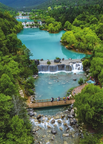 6月26日,游客在位于玉龙雪山脚下的蓝月谷游览。