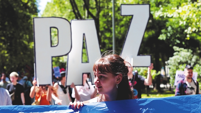 这次游行由西班牙国家和平论坛召集,来自西班牙、德国、美国、古巴、委内瑞拉等国和一些国际组织的代表参加。记者看到,在长达上千米的游行队伍中,有年轻人,也有老年人;有怀抱婴儿的妇女,也有行动不便的残疾人。