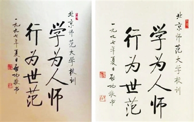 “启功作为北师大的著名教师,他和学校有着深厚的情感,在他去世多年后,学校将他亲笔写下的校训换成伪作印在学生证上,是对他的不尊重,也是对学术的不严谨,这种行为具有侮辱性。”一位启功书法爱好者对记者表示。