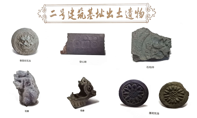 建筑历经不同时代的更迭,在损毁与重建中完成着命运的交替。田野考古中,常常面对早晚期建筑叠压、层位关系和遗迹现象复杂难辨的情况。2018年下半年,考古人员在原有发掘区的北部进行了深入发掘,两处更早期的建筑基址浮出地面。经考古人员初步判定,基址年代分别为唐代中期和北朝晚期,同时也印证了晚期建筑是在原址上扩建而成。在二号建筑基址中,还出土有大量板瓦、筒瓦、脊头瓦、方砖、莲花瓦当等建筑构件和残碑碎块,其中可修复器物约130余件。