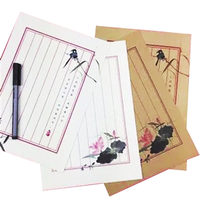 笺纸,始于唐代。《文房四谱》载:“唐薛涛尚斯色而好制小诗,惜其幅大不欲长剩之,乃命匠人狭小为之,蜀中才子既以为便,后减诸笺亦如是。”薛涛设计的笺纸,称为“薛涛笺”,是一种便于写诗,长宽适度的笺,后来亦逐渐用于书写信札。“薛涛笺”亦称“浣花笺”“松花笺”“减样笺”“红笺”。李商隐《送崔珏往西川》诗云:“浣花笺纸桃花色,好好题诗咏玉钩。”