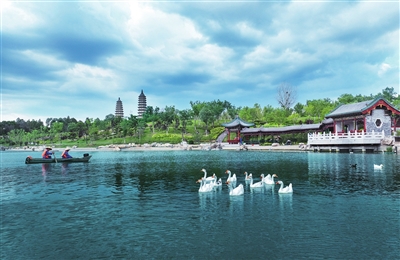 6月28日,双塔公园内,荡漾的碧波、悠然的白鹅,与远处的双塔构成了生态太原的夏日美景。 记者 宿晓健 摄