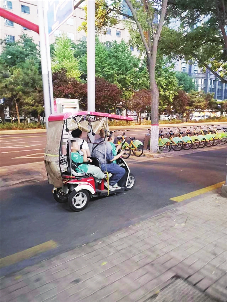 拍摄经过:6月27日,新建南路双塔西街口往南300米路西,一辆快速行驶的老年三轮电动车引起了路人侧目。驾驶电动车的是一位头发花白七旬左右的老大爷,车上还拉着一位老大娘和两个小男孩。按照规定,电动三轮车载人上路是违法行为。在此提醒大家,莫图一时方便不顾安全,一旦发生事故悔之晚矣。