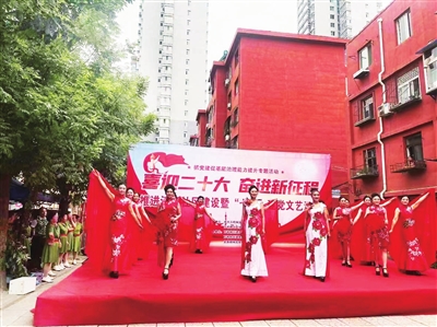 7月1日上午,新建社区联合万柏林区外国语小学、汾西医院开展“喜迎二十大 奋进新征程”建党文艺汇演活动。辖区驻地单位、社区党员、居民代表和辖区各文艺团体共100余人参加了文艺汇演。 韩睿 胡艳玲 摄