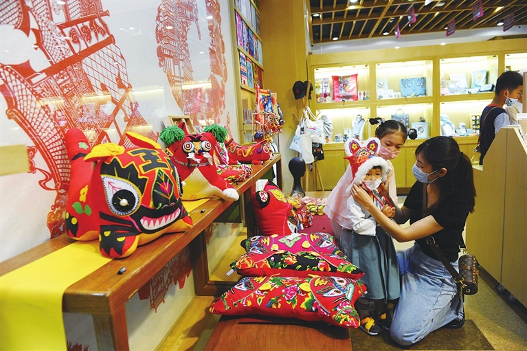 7月1日,家长正在山西博物院文创区给孩子挑选文创产品。省博结合本土非遗文化推出创意产品,引领本土国潮新时尚,受到消费者青睐。 王韵菲 摄