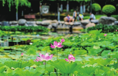 7月2日,玉门河公园荷塘里的荷花进入盛花期,吸引市民前来欣赏美景。徐浩轩 摄
