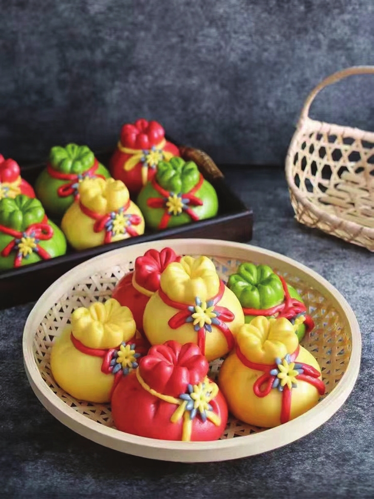 和面、发酵、捏型、雕刻、锅蒸、晾透……花馍制作步步有讲究。“和面不加一滴水,面团有黏性却不粘手,离开后手压出的指痕会很快消失。”赵卉讲述自己花馍好吃的门道。“颜色的调配更是一门学问。绿色是菠菜汁,紫色是紫薯汁,橙色为胡萝卜汁……不同果蔬榨汁为花式馒头着色,美观又健康。”