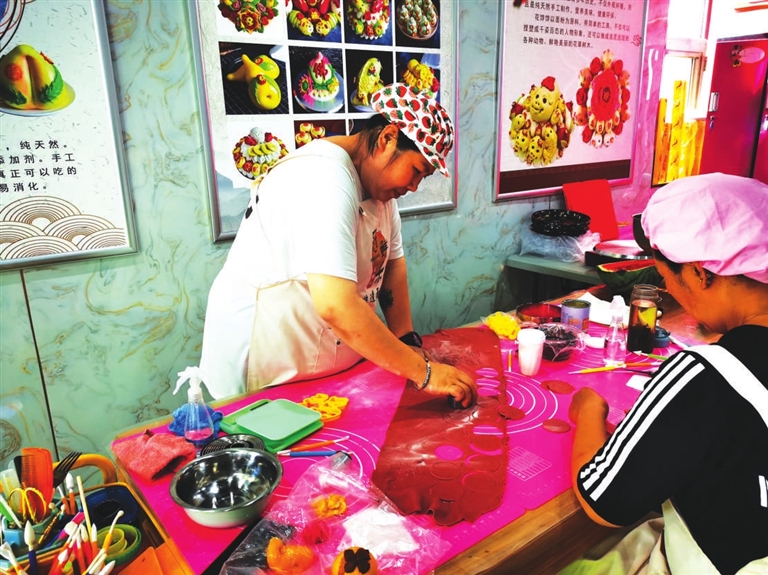 6月28日午后,在万柏林区沙沟南街的冠鲜禾手工花式馒头研习创业基地,室内温度超过35℃,赵卉依然在工作间里忙个不停。揉、搓、捏、拽、切,再利用剪刀、梳子等小工具,一个个彩色面团,在她手中变身为牡丹花、元宝、玉米等造型各异的创意花馍,不论是小朋友喜欢的卡通造型,还是老年人青睐的传统风格,她都能信手拈来。