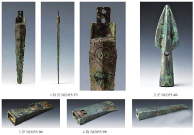 该墓葬中出土11件兵器,其中有一件短剑,尤为重要。短剑通长22.8厘米、剑身长18.8厘米、最宽3.6厘米,重150克,剑身呈长条形,中部起脊,两刃斜直,刃缘锋利,剑身横截面呈菱形。近茎格处两面均饰阴线人面纹,双合范铸造。两面人面纹头顶上方铸铭文:“楚公逆□□中戈。”