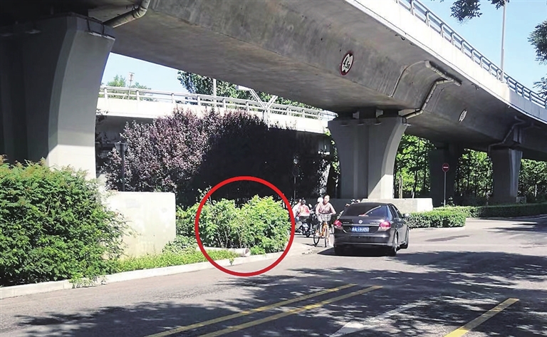 上午10时许,记者在现场看到,滨河东路通往滨河东路辅路的通道为东西向,与南北向的滨河东路辅路形成一个丁字路口。一辆轿车从滨河东路辅路由南向北途经该路口,由于丁字路口西南角近两米高的绿植遮挡,司机没有看到从通道内由西向东驶出的电动自行车,险些发生碰撞,吓得连连鸣笛。