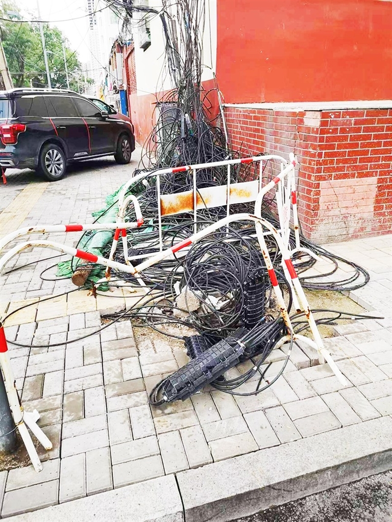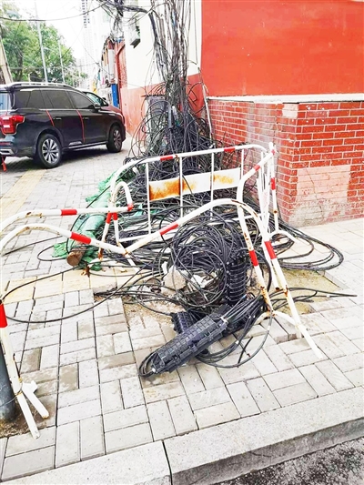拍摄者:王先生 拍摄经过:7月6日,小东门街与新开南巷交叉口东北角,悬于居民楼外墙的线缆如瀑垂落,在便道缠成一团乱麻,十分影响通行和市容,希望相关部门尽快处理。 郭晓华 整理 (报料人:王先生 报料费:30元)