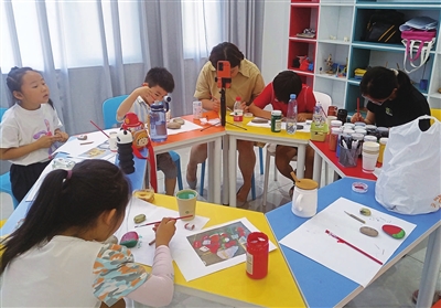 石头画作为开营后的第一个活动项目,得到了孩子和家长的热捧。石头画,顾名思义就是在石头上作画,先用铅笔在石头上勾勒出形状,再用颜料上色,可以激发孩子们的动手能力与学习兴趣。