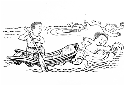 有陈曦在旁保驾护航,我们的动作自然多了,交替展示多种泳姿,并未感到很吃力,不觉已游到对岸,爬上湖堤,互相打趣。一边小憩,一边环顾新鲜陌生的西岸,回望湖心,沉浸在横渡成功的愉悦中。已是夕阳西下,三人划船返回。一人划桨,两人闲坐,一叶小舟,满载得胜后的欢声笑语。认知有些得意忘形,“扑通”一声,一只桨坠落水中,左右急寻不得,估计已沉入湖底,三人面面相觑,一时不知如何是好,情急之下,幼军举起一只拖鞋,“我们以鞋代桨吧!”于是,二人以鞋做桨在左,一人持船桨在右,小船歪歪扭扭继续向前驶去。