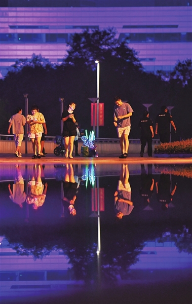 7月8日晚,长风商务区市民结伴休闲,享受夏夜的凉爽。 邓寅明 摄