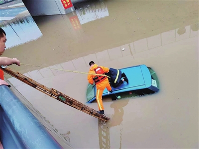 7月10日清晨5时18分,消防救援部门接到报警后,立即派出南社消防站的救援人员赶到西机路铁道桥下。经现场了解,被困车辆位于西机路铁道桥下由南向北方向的辅路,这是一辆蓝色汽车,只剩车顶在水面之上,剩余位置全被淹没。进一步了解,此处水深约1.5米,已产生不小的浮力,被困车辆的稳定性不好,该男子从车里撤出后,再不敢贸然行动,只能在车顶等待救援。水中浸泡,再加上紧张,清晨的气温也相对低一些,男子体感很差,消防救援人员首先抛给他一件上衣,助其保暖。随后,救援人员使用绳索和二级拉梯相配合,一名救援人员下到车顶接应,将被困者救出。
