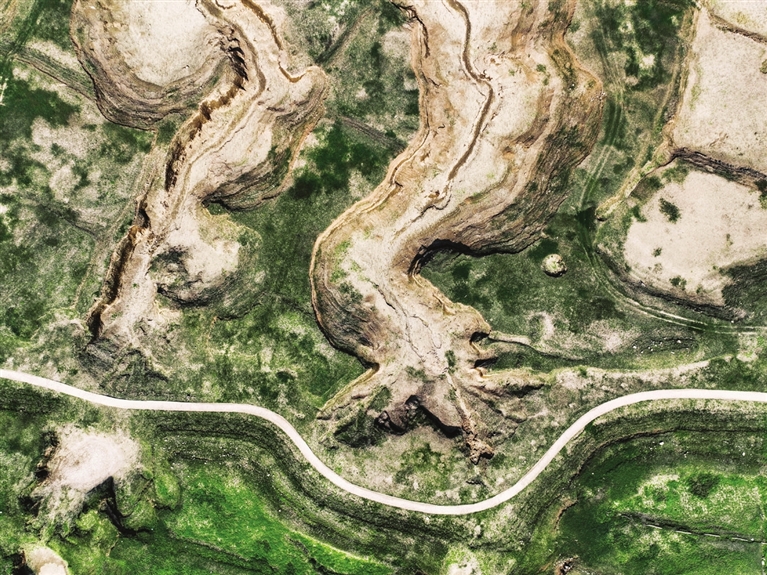 近日,随着黄河小浪底水利枢纽汛前调水调沙的结束,黄河小浪底库区水位下降,大面积河床裸露出水面,河水在河床上冲刷留下的痕迹形成黄河“沙画”。 新华社 发