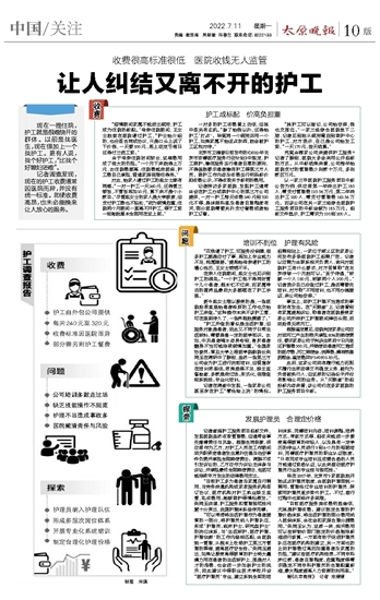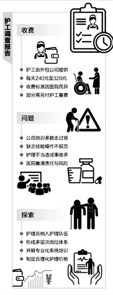 “目前护工多为患者及家属自行聘用,与劳务派遣机构或家政服务机构签订协议,医疗机构对护工执业缺乏监管,乱收费用、超额陪护等情况频发。”朱同玉谈道,护工服务和管理规范性问题十分突出,我国护理体系亟待完善。