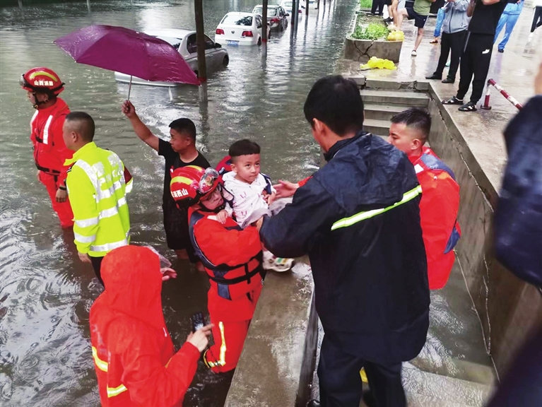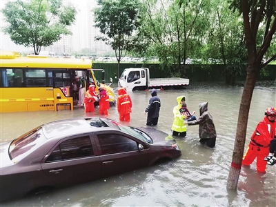 7月11日下午6时许,一辆校车行至龙康南街时,遇积水被困,车上的20多个孩子亟待救援。接到报警后,消防救援人员、公安民警等赶到现场,站在积水中,采用接龙的形式,将孩子们一一转移至安全地带。