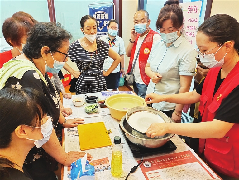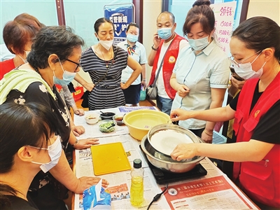 “孩子们都喜欢吃面皮,我很早就想做,但不知道怎么做,今天有志愿者义务教我们,实在太好啦!”当日下午,家住铜锣湾小区的李阿姨,早早来到现场,等待志愿者传授“技艺”。“制作面皮,配面比例、打匀面糊是有讲究的。其配料需要黄瓜、麻油、酱油、花椒、味精!”志愿者王老师手把手教大家,经过大家一个半小时的努力,一张张诱人的面皮做好了。