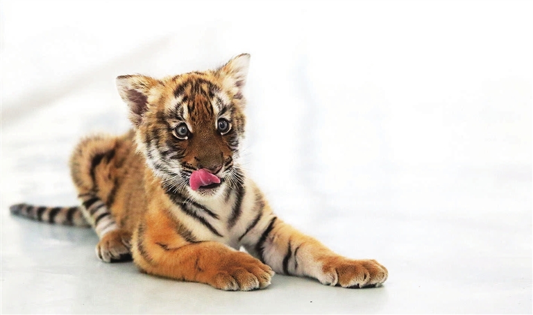 当日,中国华南虎苏州培育基地的一只雌性小华南虎首次与游客见面,萌态十足。这只小华南虎出生于2022年4月29日,目前生长情况良好。
