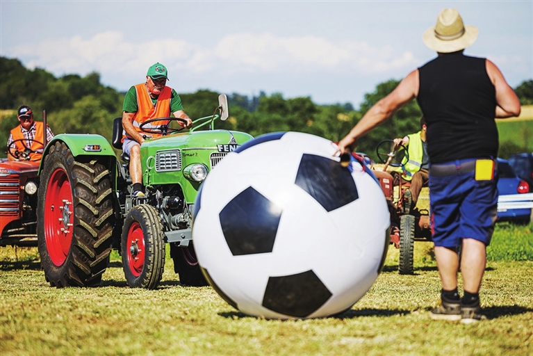 7月9日,人们在瑞士大方丹参加拖拉机足球赛。当日,在瑞士大方丹举行的传统丰收节上,人们驾驶老式拖拉机进行了一场别开生面的足球赛。新华社 发
