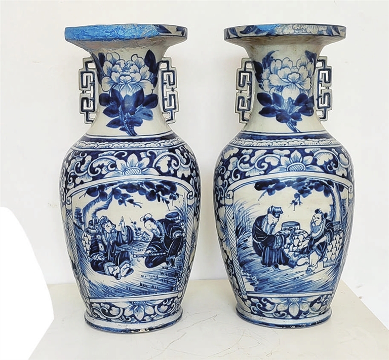 一对青花八仙人物纹双耳盘口瓶,是孟家井窑民国时期彩绘瓷的代表作。正面主题纹饰为“八仙人物”,背景图案为花卉纹饰,在彩绘艺术上吸收和运用了中国画的元素,既有装饰性很强的图案结构和艺术形象,又有国画笔墨的艺术魅力,充分体现出传统艺术浓厚的民族气息和独特的艺术风格。