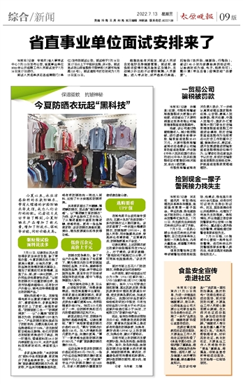 今夏以来,冰丝凉感面料的长款防晒衣、带有大帽檐的护脸防晒衣等走俏,成为人们出行的标配。记者近日走访市场了解到,今夏防晒衣产品增加了新元素,增加了防泼水、驱蚊等功能,同时价格走高。