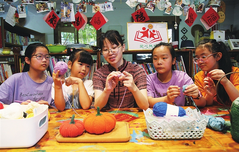 7月12日,浙江省台州市路桥区新桥镇金良社区儿童之家,小朋友在志愿者(中)辅导下学习毛衣编织。