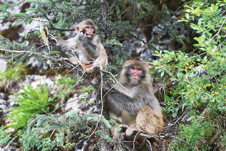 青海省玉树藏族自治州囊谦县是澜沧江流域重要生态屏障,在海拔近4000米的囊谦县白扎林场,栖息着成群的藏猕猴。新华社 发