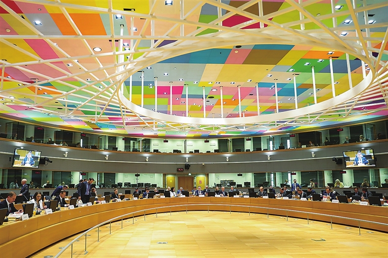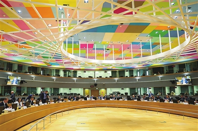 这是7月12日在比利时布鲁塞尔拍摄的欧盟经济和财政部长会议现场。 当天,欧盟经济和财政部长会议在比利时布鲁塞尔举行。新华社 发