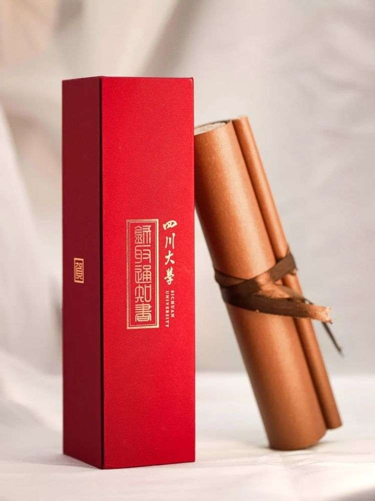 今年,四川大学录取通知书改版“上新”了,新版录取通知书以“锦凤传书”为设计概念,整体以“书卷”的形式徐徐展开,书卷以褐色与金色为主,古朴且富有历史厚重感。 |