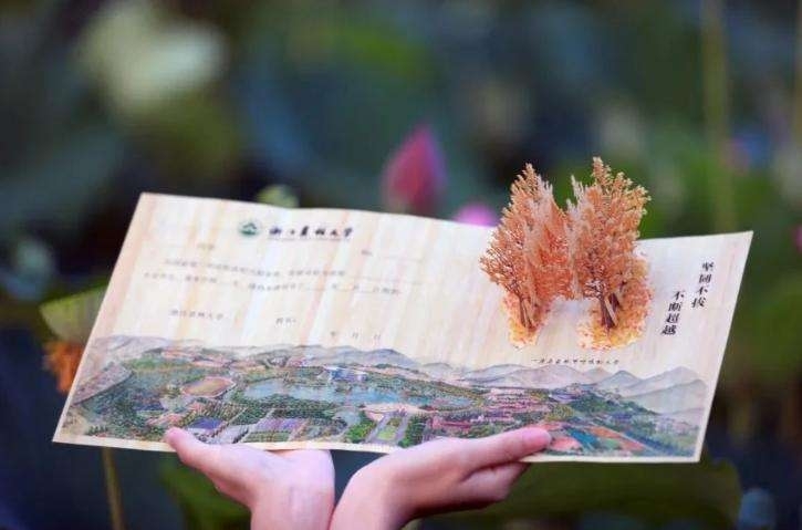 浙江农林大学录取通知书可谓是“最科技”,以刨切微薄竹为原料制作,不到3张普通A4纸的厚度,可任意对折、侧压、卷曲,可像纸张一样卷曲成轴。录取通知书展开后,右上方是由刨切微薄竹制作,立体可折叠的银杏树林造型。 |