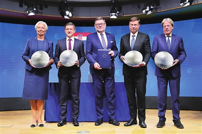 7月12日,欧洲央行行长拉加德、克罗地亚副总理兼财政部长兹德拉夫科·马里奇、欧盟轮值主席国捷克财政部长兹比涅克·斯坦尤拉、欧盟委员会负责经济事务的执行副主席瓦尔季斯·东布罗夫斯基斯和欧盟委员会负责经济事务的委员保罗·真蒂洛尼(从左至右)在比利时布鲁塞尔出席克罗地亚加入欧元区法律文件签署仪式。